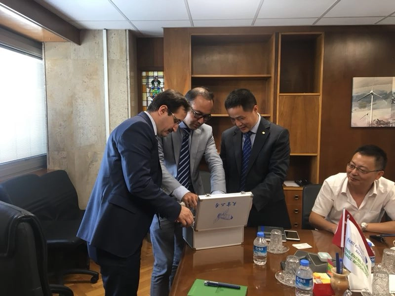 Xi Rongbiao, general manager of PV Turkish company, attended the symposium and presented the “Tiangong 2” model to Dr. Oguz Can.