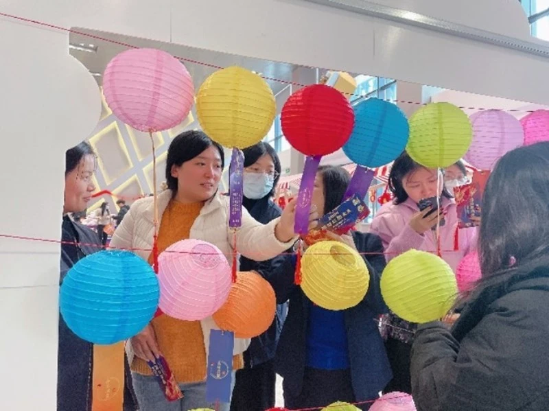 员工们领取了游园券,穿梭在各个打卡项目中:猜灯谜、射箭、巧接绣球。大家互相传授快速通关的技巧,现场鼓掌喝彩声不断,其乐融融。