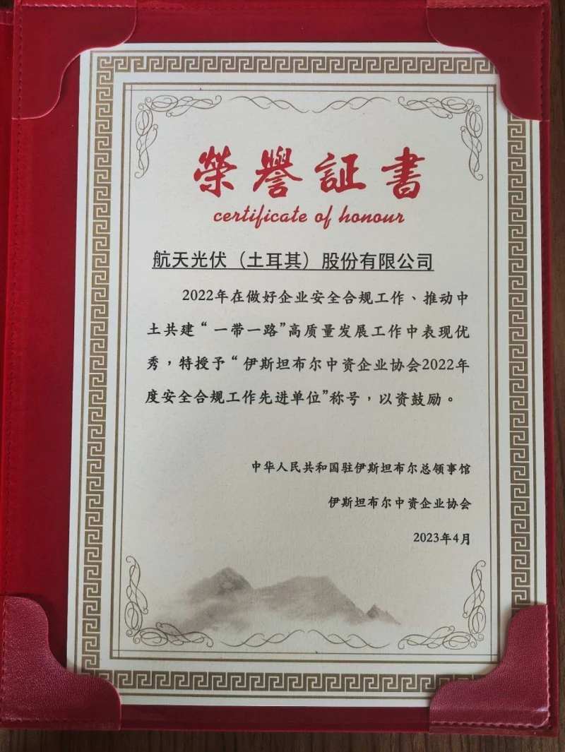 近日,航天光伏(土耳其)股份有限公司因在2022年企业安全合规方面的杰出表现而获得中华人民共和国驻伊斯坦布尔总领事馆的嘉奖,并被授予2022年度安全合规工作先进单位称号。