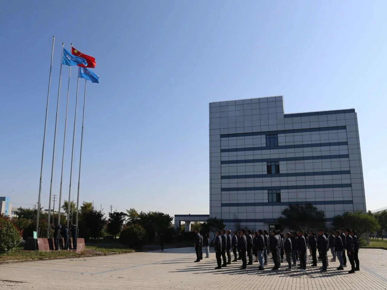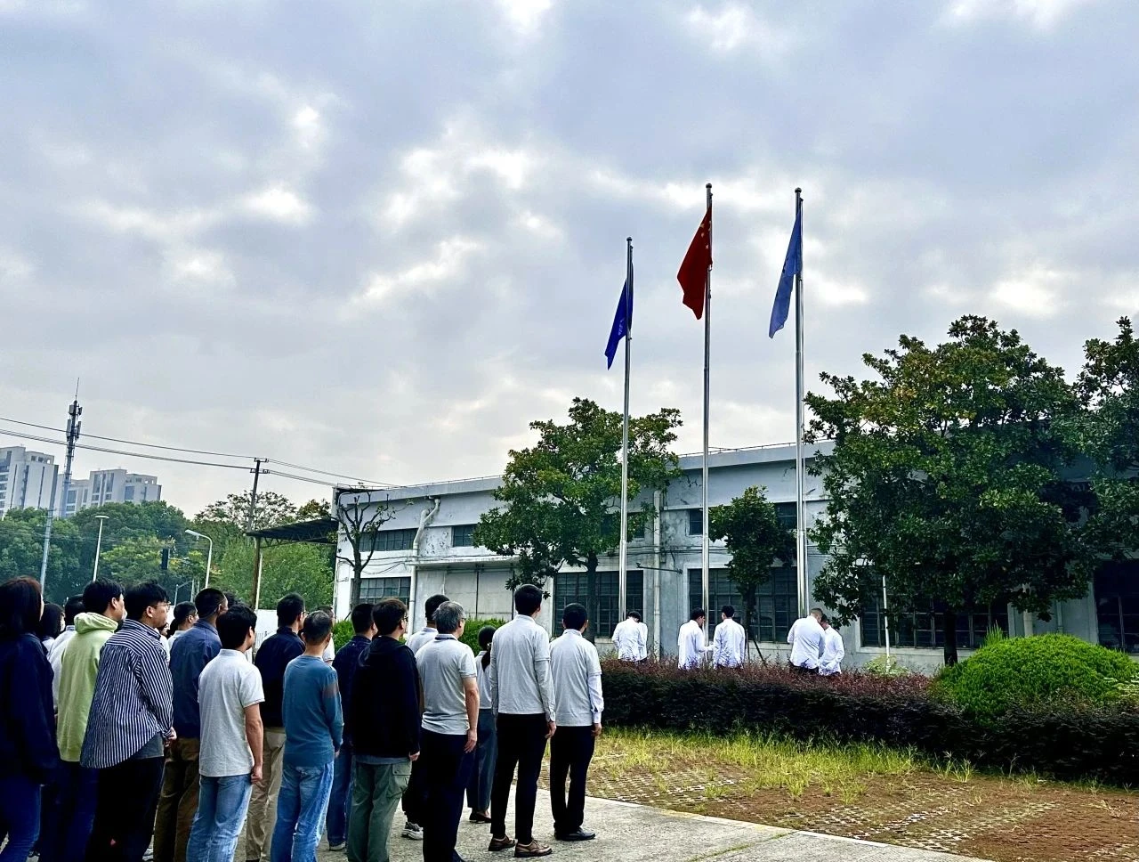 升旗仪式由公司总经理赵立主持。全体员工整齐列队,向缓缓升起的国旗、司旗行注目礼,以庄严的升旗仪式共同庆祝中华人民共和国成立75周年、中国航天事业创建68周年。赵立号召公司全体员工要进一步牢记“国之大者”,传承弘扬航天精神,强化使命担当,全力以赴确保全年工作任务圆满完成。当日,航天机电所属爱斯达克总部、常熟工厂、沈阳工厂及连云港新能源同时举行了升旗仪式。